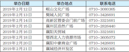 1.鄂西北人力资源市场:自2月11日起,工作日上午举办招聘会。地址:襄阳市襄城区檀溪路160号,电话:0710-3607590。