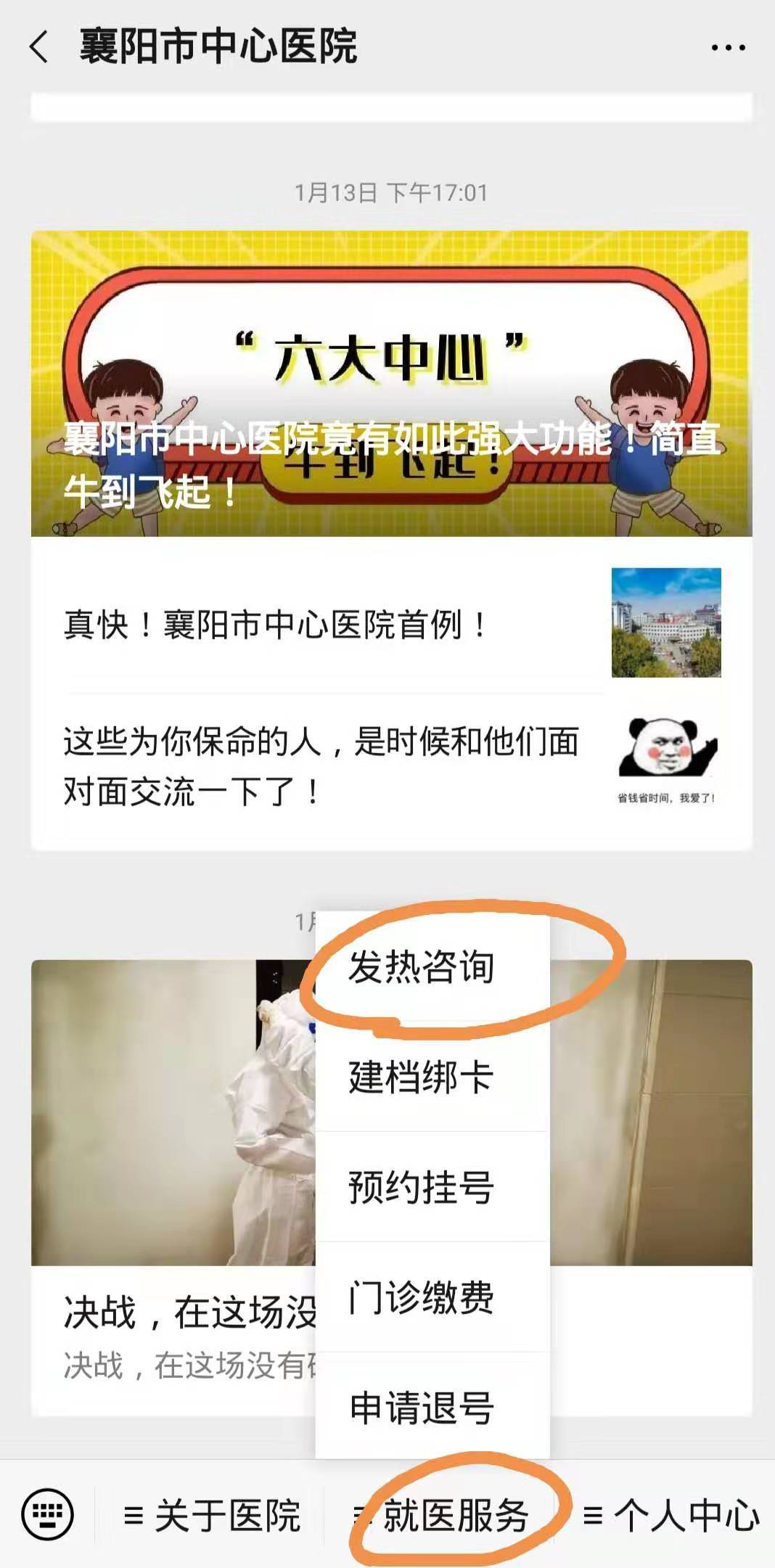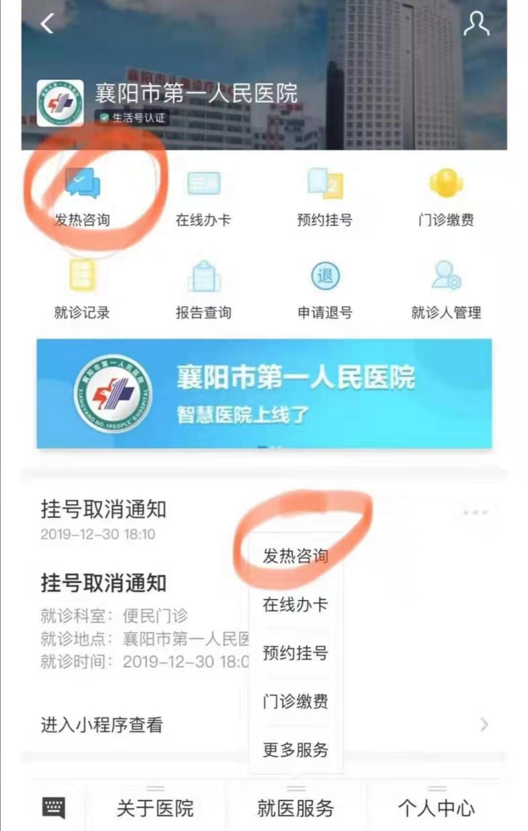 一是关注“襄阳市中心医院”“襄阳市第一人民医院”微信公众号,在就医服务一栏中有“发热咨询”入口(如下图);