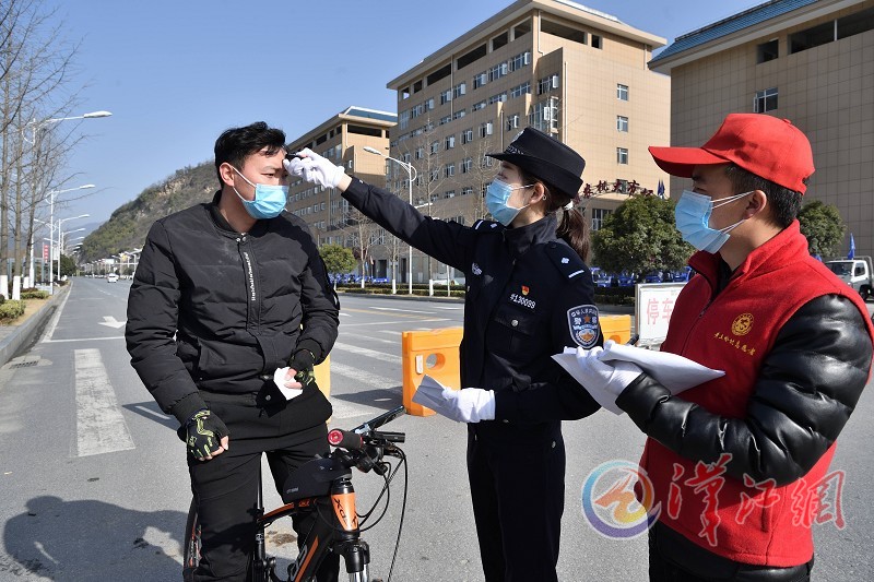2月22日,冯小倩在保康县熊绎大道疫情防控卡点为过往人员测量体温。冯小倩今年26岁,是广州市公安局特警支队民警,老家在保康。今年春节,她和丈夫一起回保康探亲,因疫情影响无法返回广州。她主动请缨,征得广州市公安局、保康县公安局同意后,在当地参加疫情防控工作。