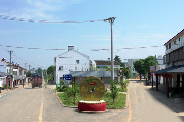 为了突出花鼓戏文化,村里还利用废弃水塔结合花鼓戏特色修建了标志性景观——水塔大鼓,在村文化广场前制作了以鼓和铜币为元素的孔畈村标。