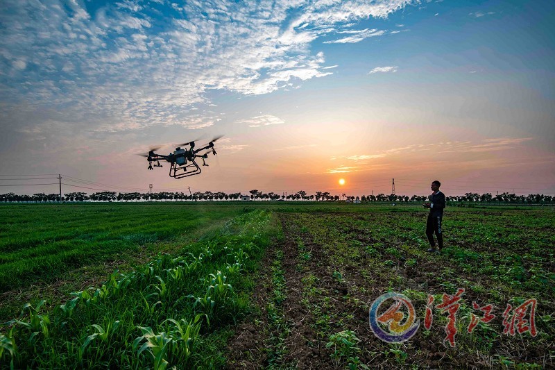 7月3日,在襄州区双沟镇东王岗村,操作手操作植保无人机为玉米地喷洒农药。今年,该村请来植保无人机作为帮手,喷洒农药的效率提高了数十倍。