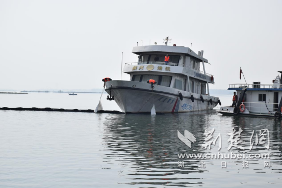 救援船舶对江面泄露油污进行清理作业。通讯员供图
