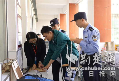 当日8时许,保康县公安局执勤民警冯适、蒋峰在县一中门口协助开展考生入场安检时,发现一名拄着拐杖的考生在家长的陪护下艰难来到考点。民警迅速上前搀扶,了解得知该考生前不久骑车摔倒,导致左腿粉碎性骨折,但为了这次考试已准备了许久,不想轻易放弃,特地在家长的陪护下从丹江口市来保康赴考。