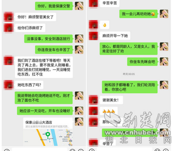 为了安全,一大队高警接过杨女士方向盘,将她们母子安全送到保康县城高速公路出站口,后移交保康高警做善后安抚工作。面对情绪极不稳定、还要坚持连夜开车回娘家的杨女士,保康警方调整策略,分别从交警大队选派年龄相仿、同为母亲、擅长做思想工作的女警冯靖棋、但红梅,及城关派出所出警民警陈佳、付裕轮流开展劝导工作。