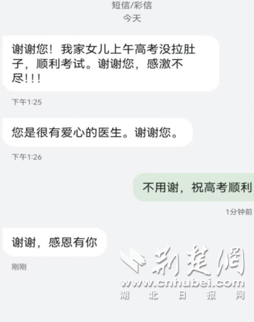 荆楚网(湖北日报网)讯(通讯员 姚燕)“您是很有爱心的医生,谢谢您,感恩有你!”6月7日,一条饱含深情的短信在襄阳市第一人民医院传开,为该院在高考期间全力保障考生健康的暖心行动点赞。