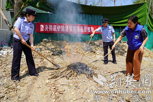 荆楚网(湖北日报网)讯(通讯员 欧阳智慧 王玉颖 李金荣)6月12日,民警正在湖北省襄阳市保康县城郊一空地集中焚烧毒品原植物罂粟。当日,保康县公安局组织禁毒大队民警和禁毒社工,集中对今年以来查缴的631株毒品原植物罂粟进行了销毁。随着罂粟被点火焚烧,警示人们远离毒品,珍爱生命。
