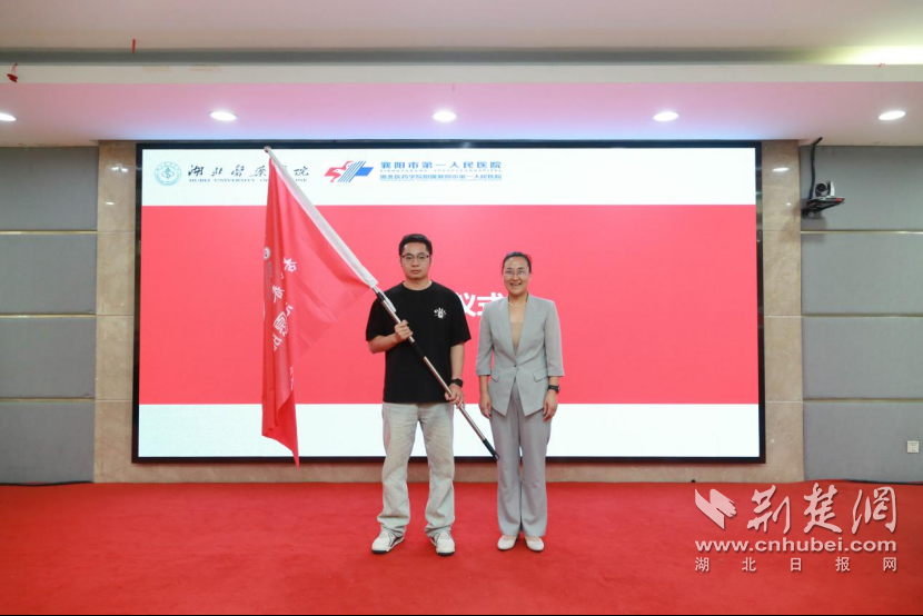 湖北医药学院党委常委、副校长、统战部部长谭艳为服务队授旗。 通讯员 供图