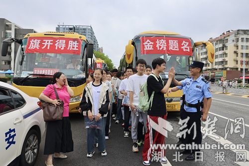 6月20日,开考首日,在宜城一中考点,考生们有序进入考场,鄢城派出所执勤民警手持加油牌,和考生们击掌鼓励,送上满满的祝福。