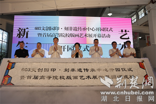荆楚网(湖北日报网)讯(记者 李蔚东 通讯员 江伟兵)为推动非物质文化遗产保护与传承,促进文化创意产业高质量发展。7月3日上午,襄阳市襄城区603文创园印·刻非遗传承中心开园仪式暨"新生·力"首届全国非遗传承创新与工艺美术行业产教融合共同体院校版画艺术展在襄阳市襄城区603文创园隆重召开。