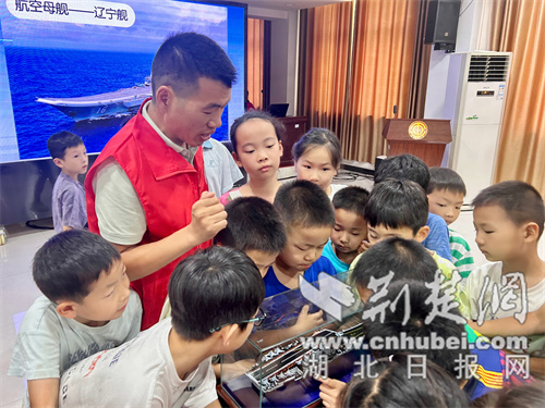退役军人、枣阳市老兵宣讲员沈太艮走到课堂中间,搬出“辽宁号”航空母舰模型,吸引了孩子们的目光,大家纷纷涌上台前争抢着观看。“我在电视上见过辽宁舰,是我国的第一艘航空母舰。”“这上面还能跑飞机,太大了吧!”“我将来要在航母上当海军。”……孩子们你一言我一语,表现出极大的兴趣。沈太艮因势利导,结合自己的从军经历,以互动问答和图片赏析的方式,为孩子们讲解了海军地位作用、海军兵种构成和舰艇知识,引导他们关心海防、热爱海军,努力学习科学文化知识。