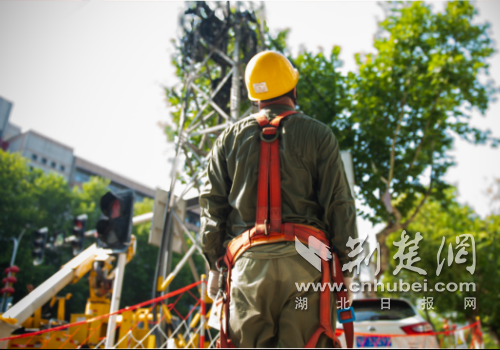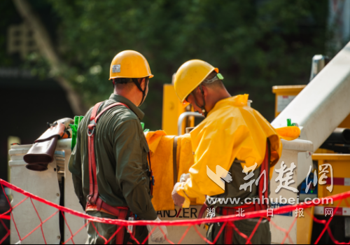 面对37℃以上的持续高温"烤"验,国网老河口市供电公司多措并举打响迎峰度夏保电攻坚战。7月16日,在10千伏光西四回线路作业现场,带电作业人员身着厚重绝缘装备,在狭小的绝缘斗内完成高空带电更换作业,确保周边居民用电不受影响。