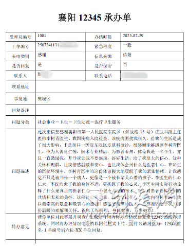 荆楚网(湖北日报网)讯(通讯员 宁婧、卜素、秦玲玲)近日,襄阳市第一人民医院皮肤科收到一份来自“12345”政务服务便民热线的特殊“工单”。起初,看到“工单”,工作人员心中一紧,担忧是患者投诉。然而,当仔细查看这份工单,映入眼帘的并非抱怨之词,而是一位女大学生对皮肤科李树青副主任医师满怀深情的感激与赞扬。