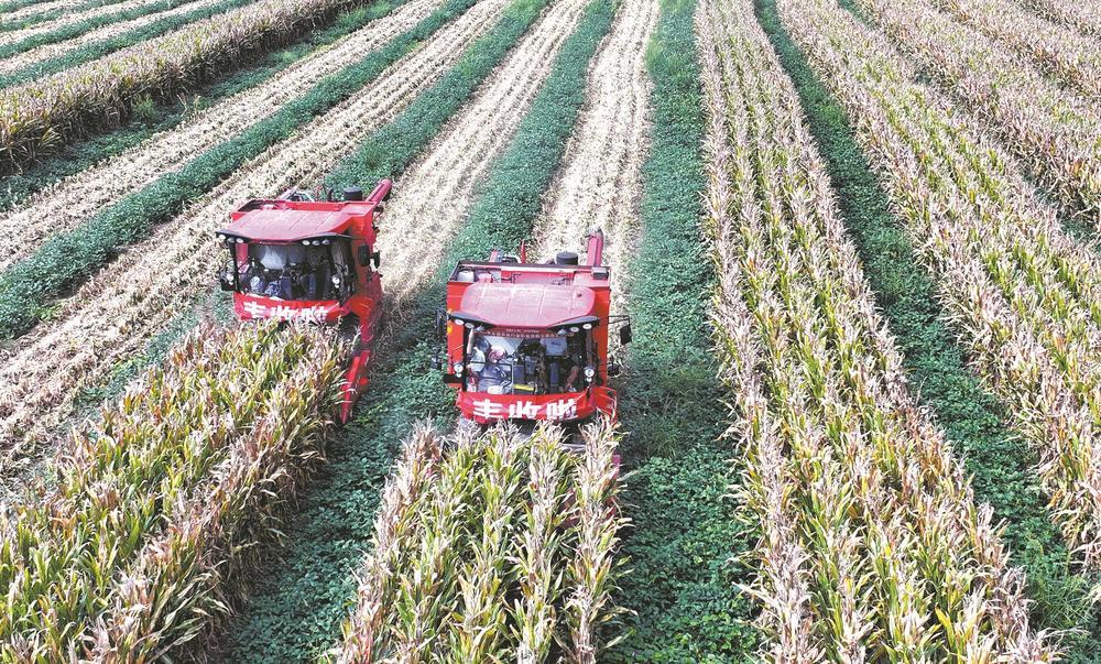 9月15日,收割机正在南漳县武安镇湖北陈家集农业发展有限公司的500亩玉米大豆带状复合种植生产示范基地收获玉米。