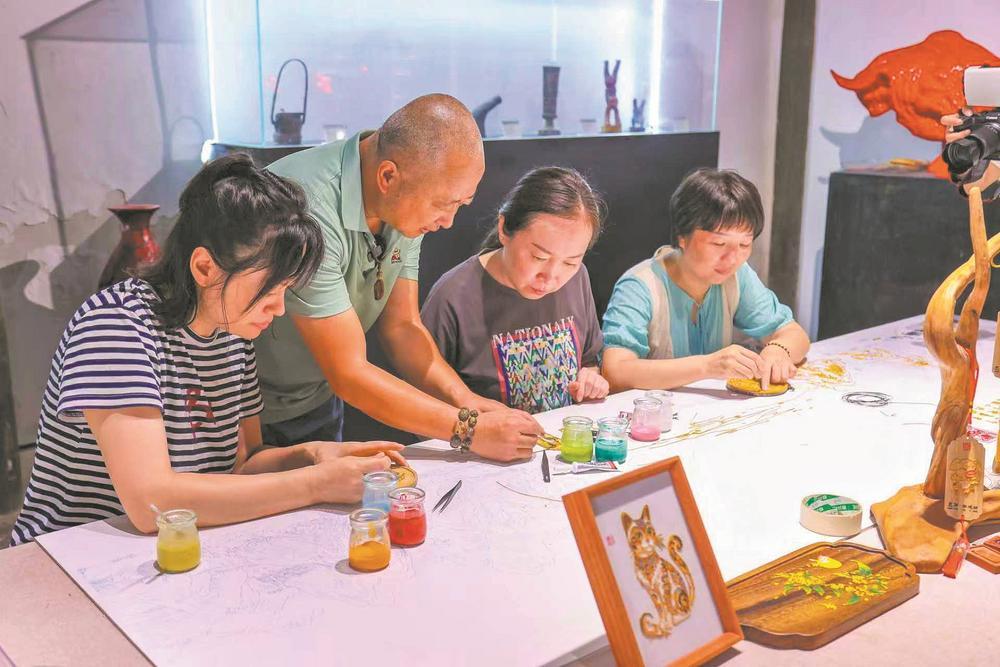 9月16日,市民在小江西会馆体验非物质文化遗产金丝珐琅画的制作。