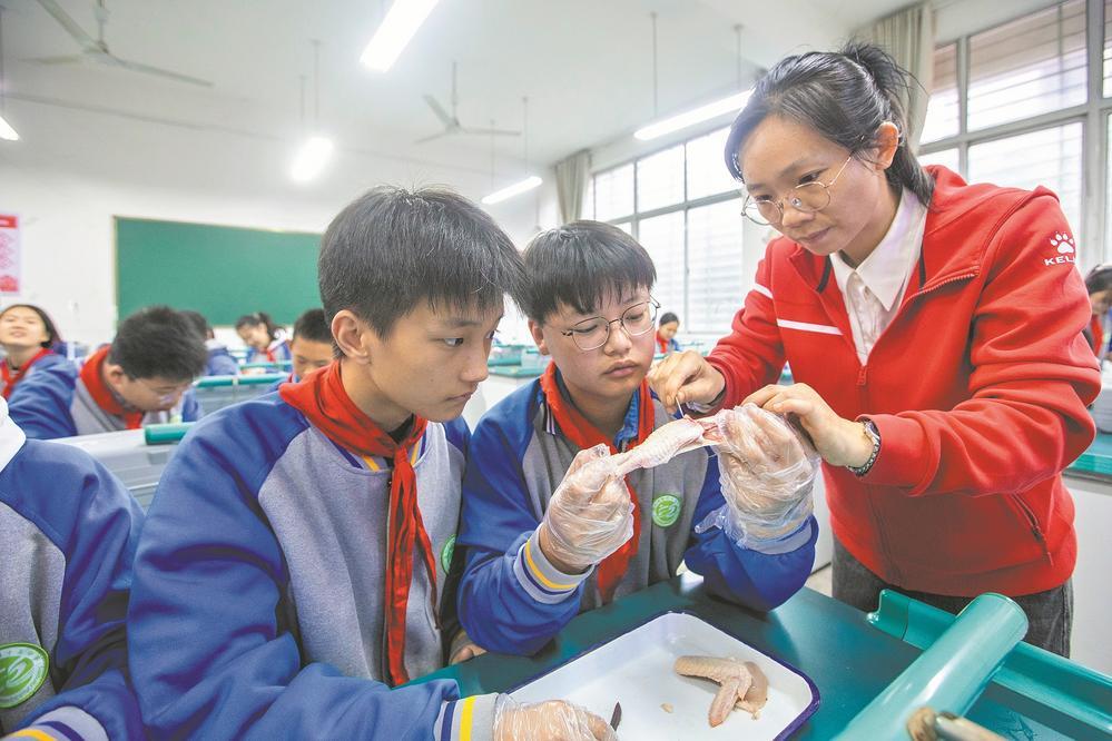 课堂上,学生们化身“小小生物学家”,在老师的指导下,通过观察、剥皮肤、识肌肉、探骨骼等,了解动物的运动系统,更好掌握课本知识。