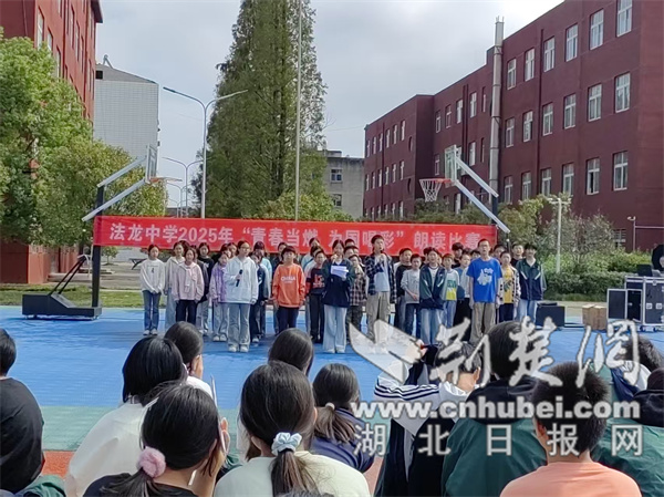 荆楚网(湖北日报网)讯(通讯员 蔡桂娥 曾雪飞 刘小燕 王锐)为通过经典诵读弘扬爱国主义精神、展现当代青少年精神风貌,9月30日襄城区法龙中学在学校篮球场成功举办了“青春当燃 为国喝彩”主题朗诵比赛。