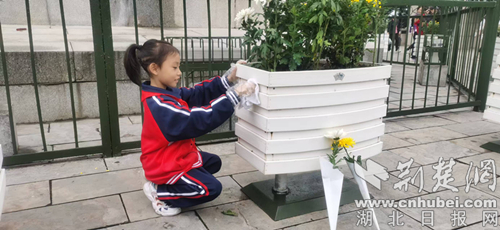 默哀结束后,学生们依次到纪念碑前,敬献菊花。洁白的花朵,象征着先烈纯洁而伟大的品格,也承载着后辈无限的哀思与敬仰。