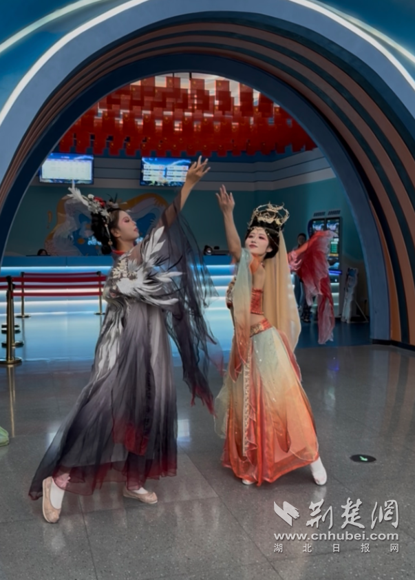 当日上午9时许,海洋馆还未开馆,入口处已人头攒动。在大厅内,身着汉服的“嫦娥”等仙女翩翩起舞,引得游客驻足欣赏。
