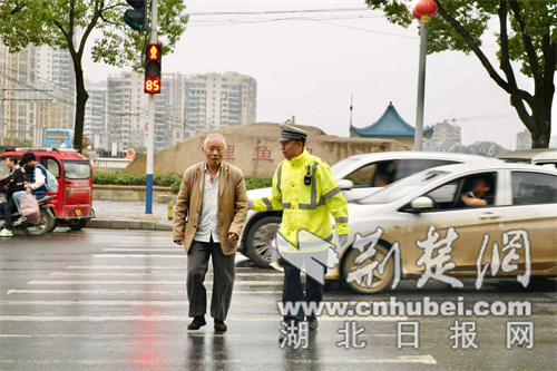 假期交警街面执勤护送老人过马路。通讯员 供图