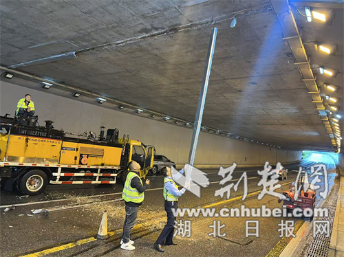 荆楚网(湖北日报网)讯(通讯员 习襄波)近日,襄阳交管支队交警大队大队长江涛在襄阳市东津新区开展道路巡查中发现,金源路1号下穿涵洞内有一根锋利的金属嵌条呈“Z”字形,从涵洞顶部垂落地面,占据双向四车道中间的两车道,对往来行车安全造成极大威胁。