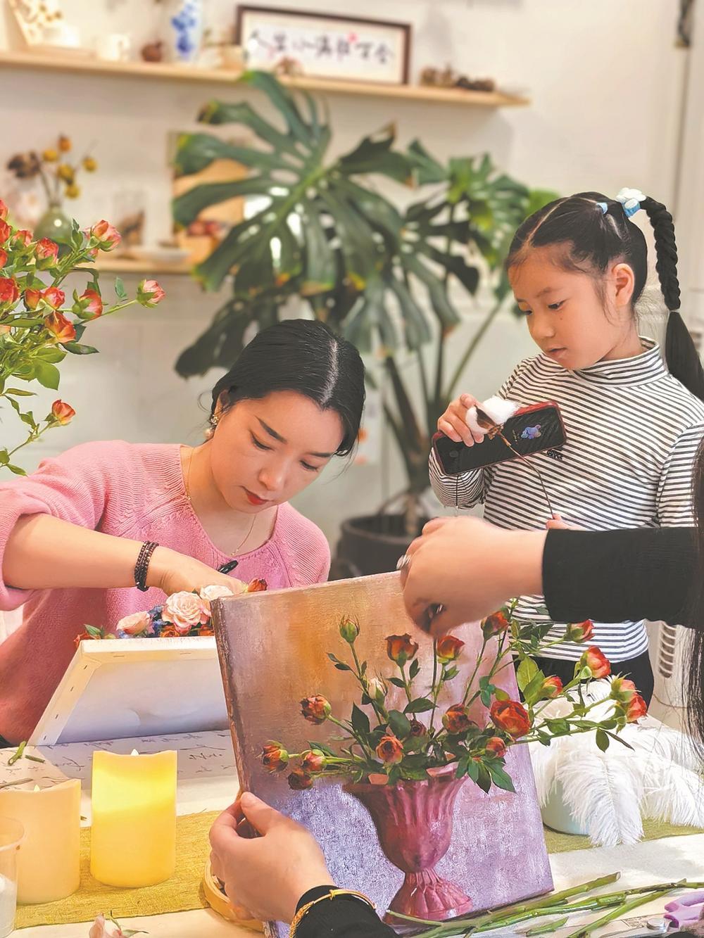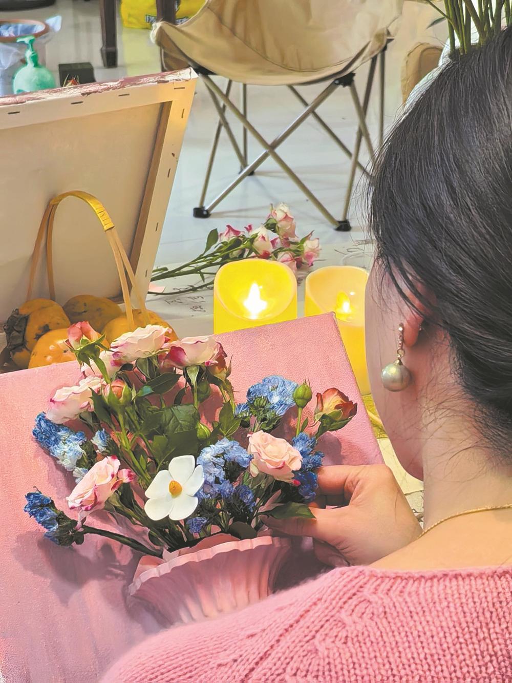 马雪毅介绍,这种半壁花瓶不用注水,花材可随时更换,如同一幅立体画作。为此她专门采购材料,并邀请专业绘画机构老师指导,仅筹备就耗时半个月。