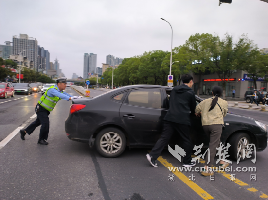 驾驶员焦急万分、手足无措时,看到正在路口执勤交警,赶紧跑上去求助。襄阳交管支队交警三大队两名辅警没有丝毫犹豫,立刻紧跟驾驶员。一名交警用手势引导后方车辆有序避让,避免交通拥堵加剧;另外一名则俯身查看车辆情况,提供救援帮助。