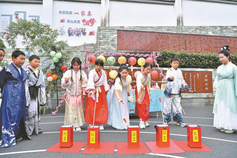 10月31日,在保康县城关镇小学诗韵雅集游园会上,学生体验投壶。当天,该校举办此次活动,将游园闯关、艺术创作、汇演实践深度融合,让学生在趣味互动中感受中华优秀传统文化的魅力。 特约通讯员杨韬 通讯员余夕雯 李兆忠 摄