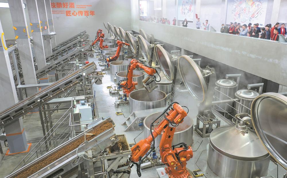 11月1日,湖北省石花酿酒股份有限公司智能化酿酒车间内,机器人挥舞手臂,有节奏地将酒醅精准铺入甑锅里,吸引参观者驻足观看。
