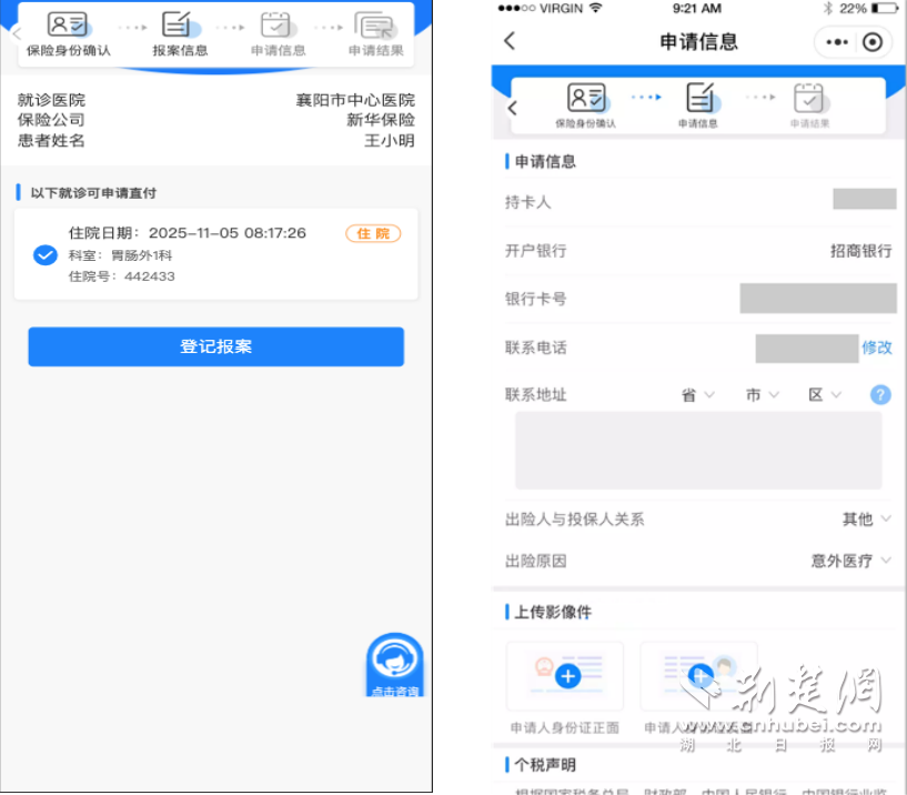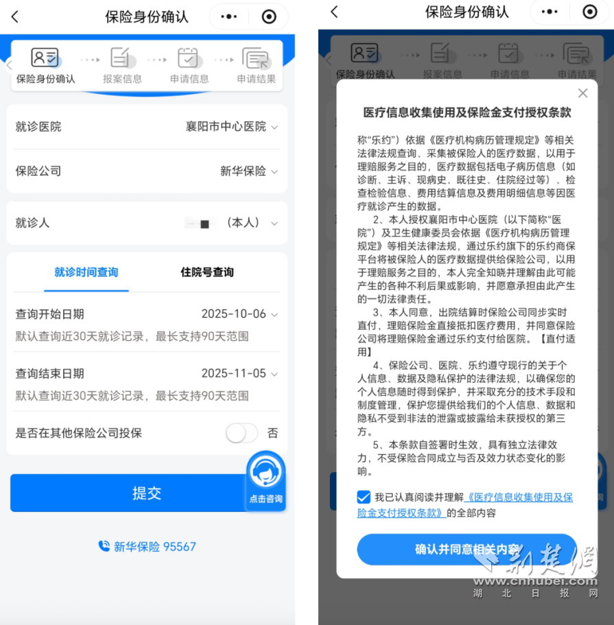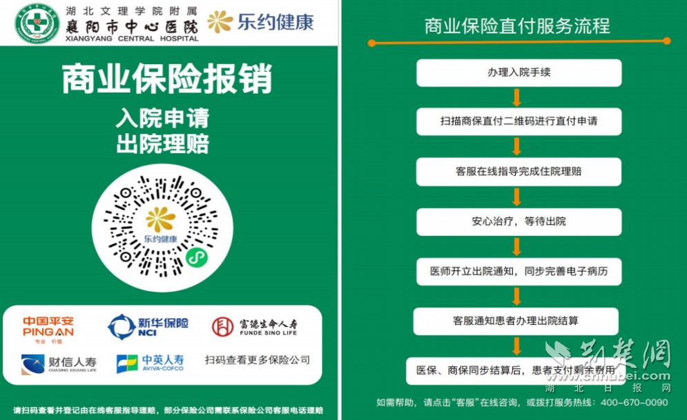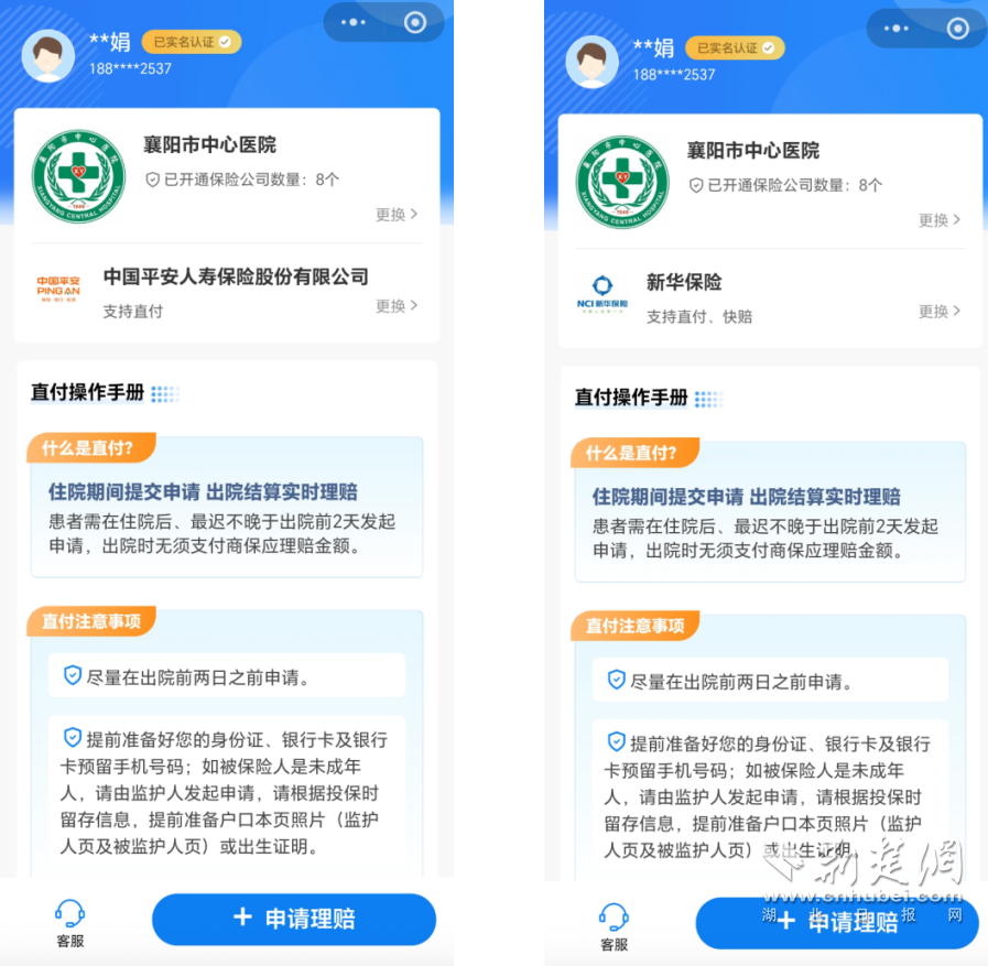 荆楚网(湖北日报网)讯(通讯员 杨济铭)还在为就医后商保理赔的繁琐手续而烦恼吗?出院结算时自己垫付的保险理赔金是不是压力山大?11月7日,笔者从襄阳市中心医院获悉,该院正式全面开通商保线上理赔服务,商保患者无需复印病历等诸多单据,不用来回跑腿报销,手机一键申请即可享受医保、商保一站式同步结算服务,商保患者零垫付、零等待、零单据、零跑腿。