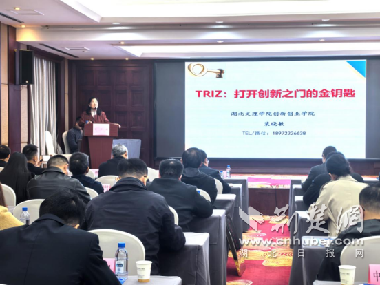 会议还邀请了湖北文理学院创新创业学院教授、市创新学会理事长裴晓敏以《TRIZ:打开创新之门的金钥匙》为题,作创新方法专题培训。裴教授从TRIZ的由来和发展、创新工具的使用等内容展开,结合案例详细分析了TRIZ理论解决实际问题的各种场景,将抽象的创新方法理论转化为一个个案例,深入浅出地阐释了TRIZ理论的的核心精髓。