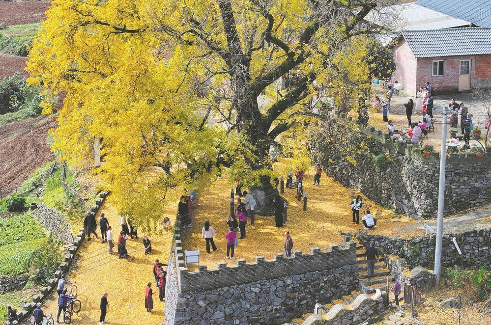 11月9日,谷城县茨河镇胡家泉村一棵千年古银杏树身披“金装”,进入最佳观赏期,吸引众多游客前来打卡。这棵需四五人合抱的古树曾因生长环境恶化濒临衰败,后经5年系统性保护重焕生机,如今成为网红景点。今年已吸引游客超2万人次,并成功推动当地农产品销售及民宿、农家乐等产业发展,成为谷城“古树+生态旅游”模式的生动实践。