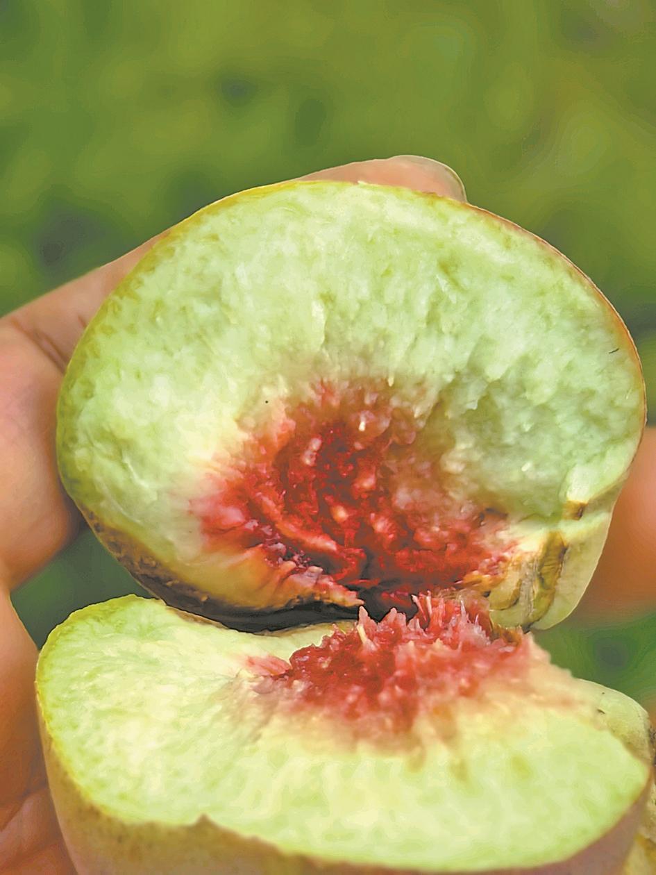 胡根江挑出裂果最严重的桃子掰开,只见果肉晶莹:“甜度和口感一点也不比好果差,做果汁、果脯都是好东西。”