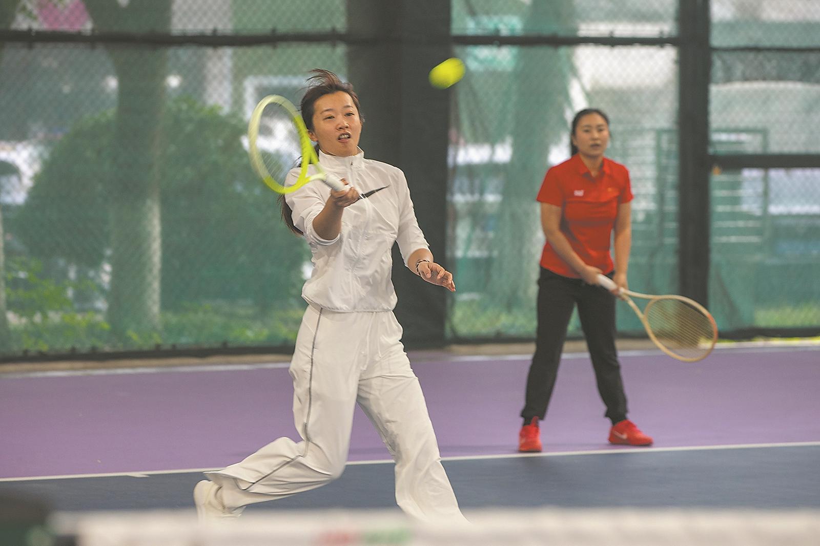 11月15日,运动员在网球场上挥拍。 全媒体记者 李旭晖 通讯员 屈松 摄