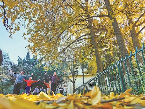 11月25日,市民在新华公园银杏树下游玩。襄阳市住新局新华游乐公园管理处对园内银杏树下区域实施“落叶缓扫”,让市民在此拍照、打卡、游玩,近距离欣赏初冬美景。
