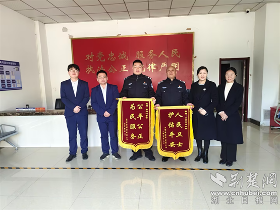 荆楚网(湖北日报网)讯(通讯员 付登科、王一凡)一面锦旗,一份认可;一声感谢,一份担当。11月27日,襄阳市科技馆工作人员将写有“人民卫士 护佑平安”“公平公正 为民服务”的两面锦旗送到襄阳东津公安分局六两河派出所,向快速化解纠纷、保障群众权益,优化法治营商环境的的民警们表达诚挚谢意。