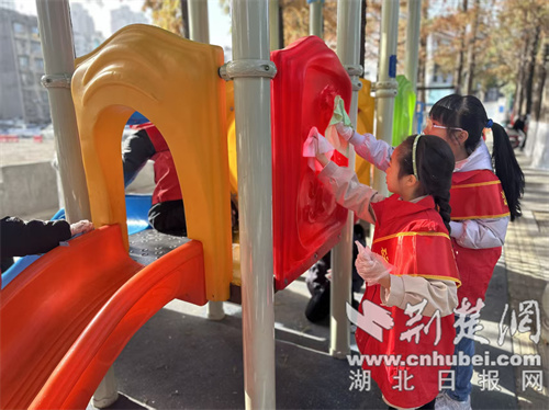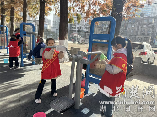活动现场,小志愿者们热情高涨,分工明确,配合默契。他们化身“清洁小卫士”,有的手持抹布,仔细擦拭着每一件公共健身器械,不放过任何一个卫生死角;有的弯下腰,认真地捡拾步道与花坛中的纸屑、落叶,让社区环境焕然一新。初冬的寒意丝毫未减他们的劳动热情,额头上渗出的细密汗珠,是他们辛勤付出的最美见证。路过的居民们纷纷投来赞许的目光,一位阿姨笑着说:“这些孩子真棒!有他们,社区更美了!”