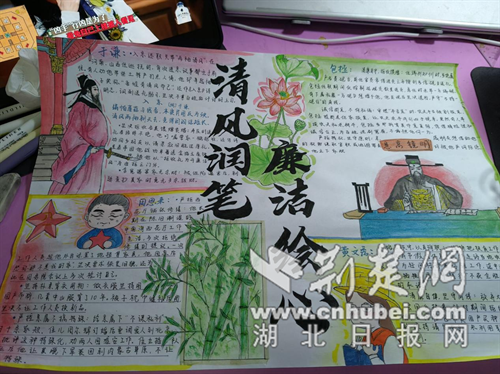 随后,活动进入核心环节——廉洁主题艺术作品展示与评选。本次作品征集主要涵盖手抄报、绘画和书法三大类别。同学们围绕“廉洁”主题,充分发挥创意与才艺,作品内涵丰富,形式多样。例如,陈思远同学的手抄报《清政莲洁,出淤不染》,巧妙运用荷花“出淤泥而不染”的意象,结合古今廉洁典范事迹,生动传递了“廉洁需日常坚守”的朴素真理;陈圆圆同学的绘画作品《党正风清》,则将象征高雅的鹤、代表纯洁的莲与庄严的党章元素有机融合,艺术化地展现了风清气正的精神追求,激励大家坚守廉洁底线。这些作品不仅是艺术创作的成果,更是同学们对廉洁文化深刻理解和内心认同的直观表达。