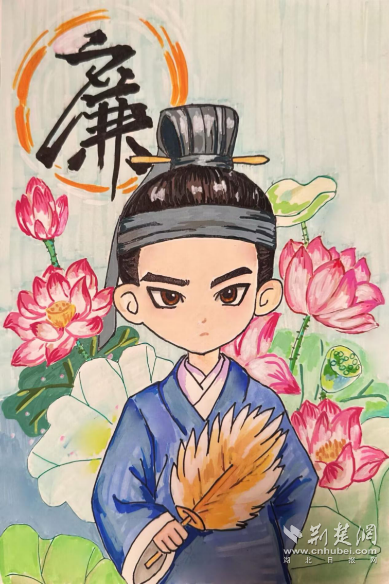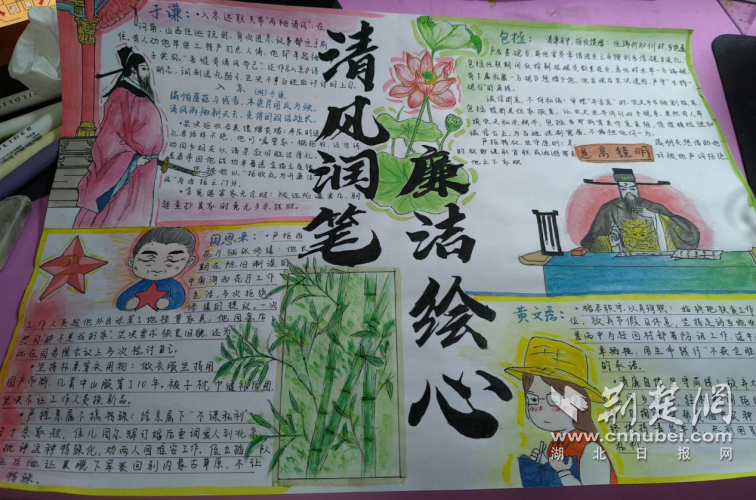 随后,活动进入核心环节——廉洁主题艺术作品展示与评选。本次作品征集主要涵盖手抄报、绘画和书法三大类别。同学们围绕“廉洁”主题,充分发挥创意与才艺,作品内涵丰富,形式多样。例如,陈思远同学的手抄报《清政莲洁,出淤不染》,巧妙运用荷花“出淤泥而不染”的意象,结合古今廉洁典范事迹,生动传递了“廉洁需日常坚守”的朴素真理;陈圆圆同学的绘画作品《党正风清》,则将象征高雅的鹤、代表纯洁的莲与庄严的党章元素有机融合,艺术化地展现了风清气正的精神追求,激励大家坚守廉洁底线。这些作品不仅是艺术创作的成果,更是同学们对廉洁文化深刻理解和内心认同的直观表达。