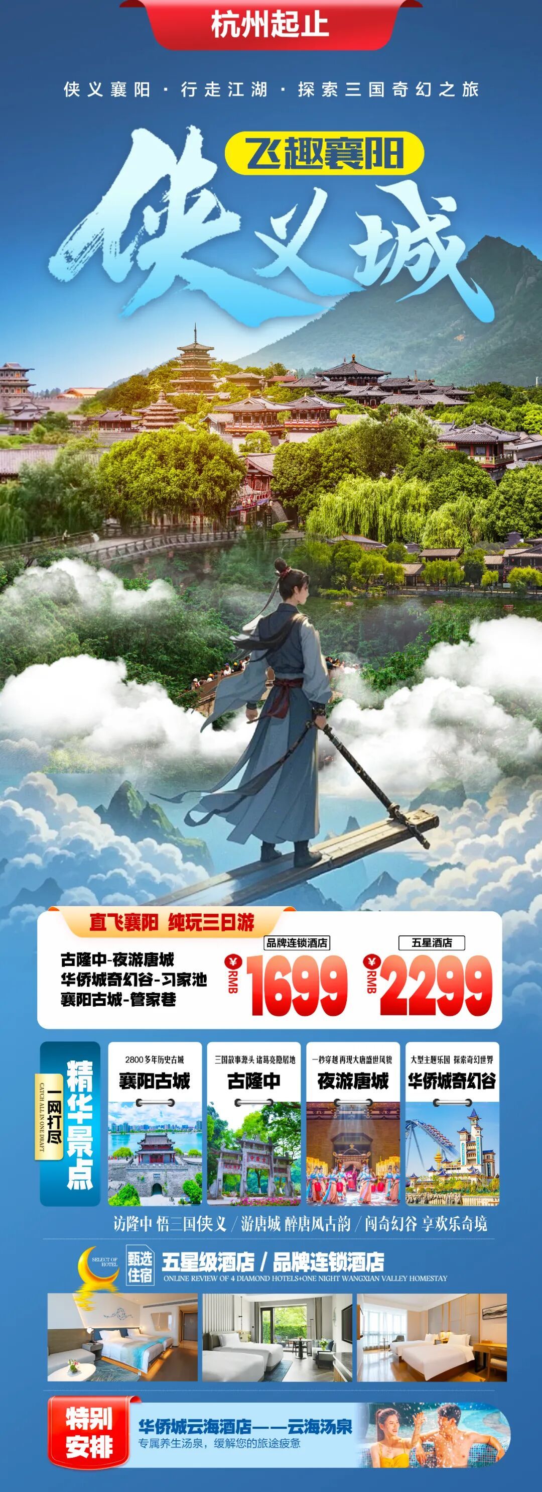 “飞趣襄阳侠义城”自由行旅游产品(三天两晚),游览景区包括古隆中、唐城、奇幻谷、云海汤泉、襄阳古城、习家池。游客从深圳出发,来襄住品牌连锁酒店1699元/人 ,住五星酒店2299元/人;从广州出发,来襄住品牌连锁酒店1699元/人,住五星酒店2299元/人;从杭州出发,来襄住品牌连锁酒店1699元/人,住五星酒店2299元/人;从昆明出发,来襄住品牌连锁酒店2299元/人,住五星酒店2799元/人。