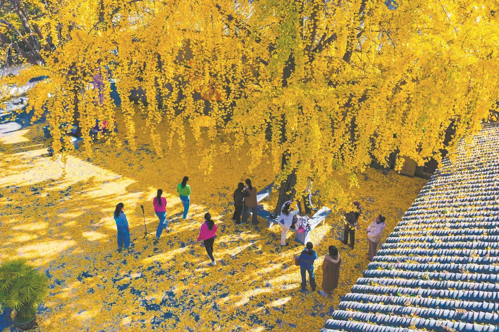 12月3日,初冬的米公祠景区一片金黄,前来赏银杏的游客纷纷开启打卡模式,争相与金黄的银杏树合影。