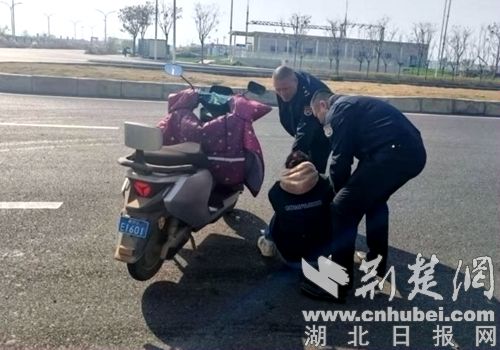 荆楚网(湖北日报网)讯(通讯员 韩金鑫)12月3日中午,襄阳高新区渣管站二中队巡查队员杨程意、郭少华行至机场路与天籁大道交叉口时,遇一起交通事故:一辆小货车突然超车变道右拐,右侧正常行驶的电动车避让不及,骑车大姐捏闸后因惯性摔倒在地。