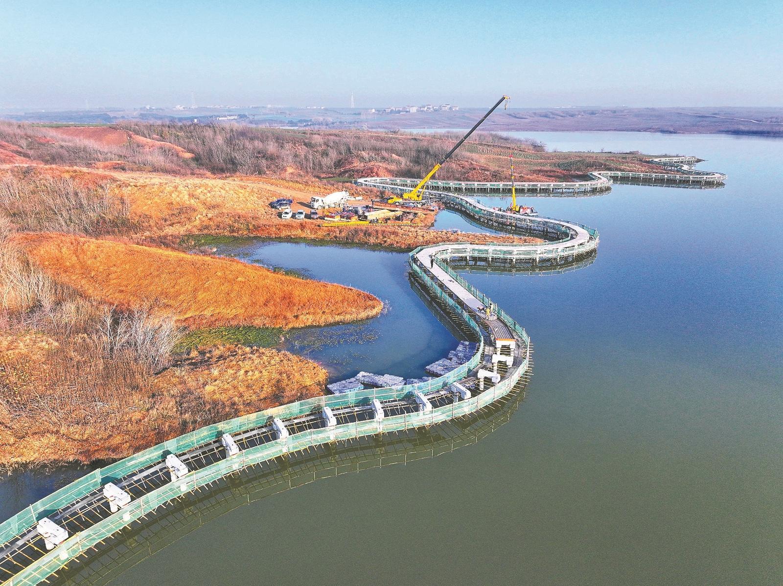 12月25日,工人在普陀堰水库加紧建设水上景观栈道。该栈道位于樊城区乡村振兴旅游公路“一号公路”起点附近,全长约1.6公里。当地积极推动“交通+旅游”融合发展,通过打造水上景观项目,丰富旅游体验,进一步吸引游客前来观光游览。