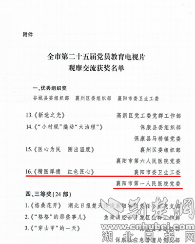 荆楚网(湖北日报网)讯(通讯员 刘晓东)近日,襄阳市委组织部印发《关于全市第二十五届党员教育电视片观摩交流活动评审情况的通报》,襄阳市第一人民医院党委报送的党员电教片《精医厚德 红色匠心》凭借深刻的主题内涵、鲜活的实践案例与精良的制作水准,荣获全市二等奖。