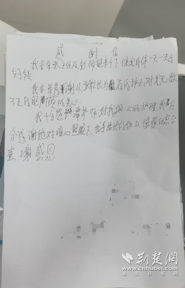 经过系统治疗与精心护理,杨先生不但血糖稳定,肺部感染、伤口感染得到控制,而且精神症状得到改善,行为及言语基本恢复正常。康复后的老人难掩感激之情,亲笔写下简短感谢信,字里行间满含着对主任张静及神志病科全体医护人员专业救治、悉心照护的诚挚谢意。