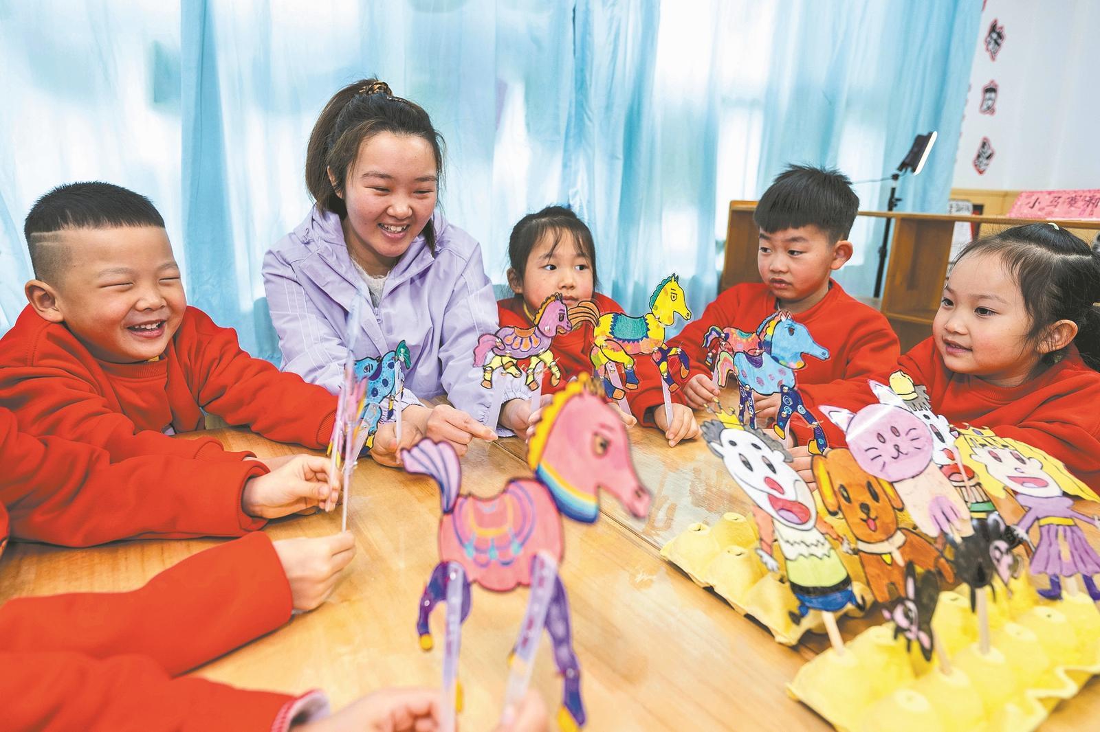 近日,在樊城区樊东教工幼儿园内,小朋友们在老师指导下,制作以“马”为主题的皮影戏道具,体验非遗文化的魅力。