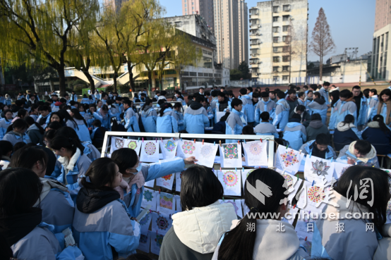 活动设置九个体验区,学生分时段参与。在“我的心情气象站”,同学们认真填写心情卡片,觉察自我情绪状态;“情绪弹飞”区悬挂着写有负面情绪词汇的纸条,同学们通过“弹飞”动作实现情绪宣泄;“心灵加油站”里,学生们抄写正能量语句,汲取心灵力量。整个操场化身为一个开放式的“心情俱乐部”,学生们在参与中体验,在体验中成长。现场还展出了学生创作的情绪曼陀罗、心情故事和心理漫画等作品,并设立投票环节,获奖作品将于下周升旗仪式表彰。