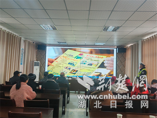 在社区综治中心会议室,民警结合社区周边道路实际,通过播放典型事故案例视频,针对非机动车逆行、不戴头盔、行人乱穿、酒驾等违法行为进行剖析。民警用襄阳方言讲解,结合居民日常出行场景,分析违法成因与法规条款,令在场居民深感警醒。