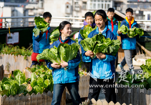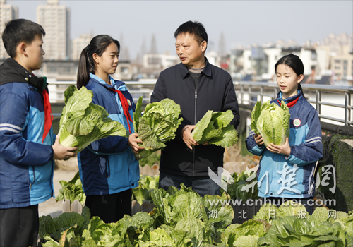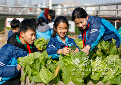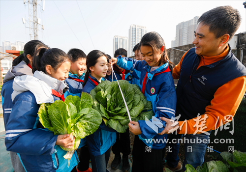 荆楚网(湖北日报网)讯(通讯员 陈昆 刘艳琴 聂志鹏)1月16日清晨,冬日暖阳映照在襄阳市晨光小学教学楼顶的“空中农场”,地里整齐栽种着翠绿饱满的大白菜,一场采摘活动有序开展。孩子们挎着小竹篮、挽起衣袖,弯腰攥住菜叶轻轻发力,拔菜的脆响伴着笑声,在楼顶飘散,为冬日校园添了几分生机。