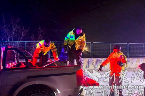 当日22时许,宜城市区内下起鹅毛大雪,交警大队民警辅警提前到岗,在一中门口开展护学,指挥疏导交通、维持道路秩序,确保高中学生安全有序放学。在襄沙大道与育才大道交叉路口处,一辆打滑面包车被困路中央,民警彭锦涛急忙下车帮助被困车辆脱困。