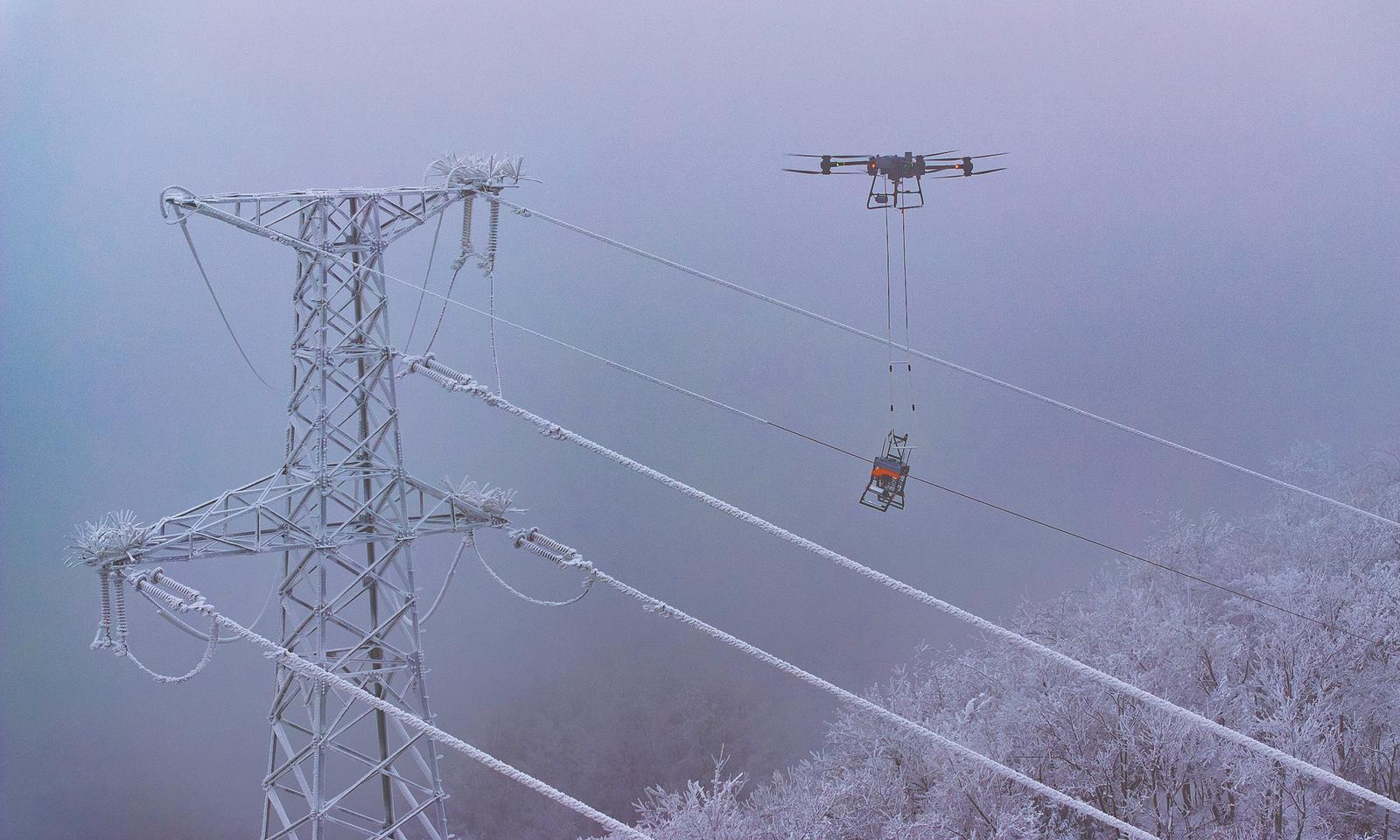 1月20日,在保康后坪镇蜡烛山村,110千伏翁天一回42-43号塔导线上方,国网襄阳供电公司输电运检分公司工作人员采用无人机将完成工作的除冰机器人吊离作业区。这台机器人搭配远程控制、自主导航及制动功能,可沿着覆冰的导线稳步前行,所过之处冰层被逐层剥离。它的速度是人工十倍,无需登高断电实现智能防护。